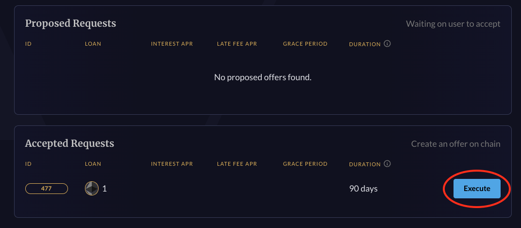 - Once in this section, the Supplier or Provider whose offer was accepted by the user will execute the offer onchain by clicking the Execute button which will prompt an onchain signature.